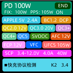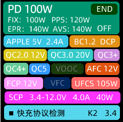 | P1主界面:快速PDO、RDO简明提示框说明(简要提示框) PD3.1 140W : PD3.1表示K2 PD抓包捉取到真实的PD通讯 140W:充电头对外供电PD广播功率最大140W 目前K2的最大值规则:不管SPR,EPR,PPS,AVS,取里面最大的 第二行: FIX 140W:表示当前申请的实际功率数值 第三行: 注意:手机申请了这个电压电流档位,不一定按这个电压、电流充电 K2 V2.0以上新版本提供多协议无感监听功能 |